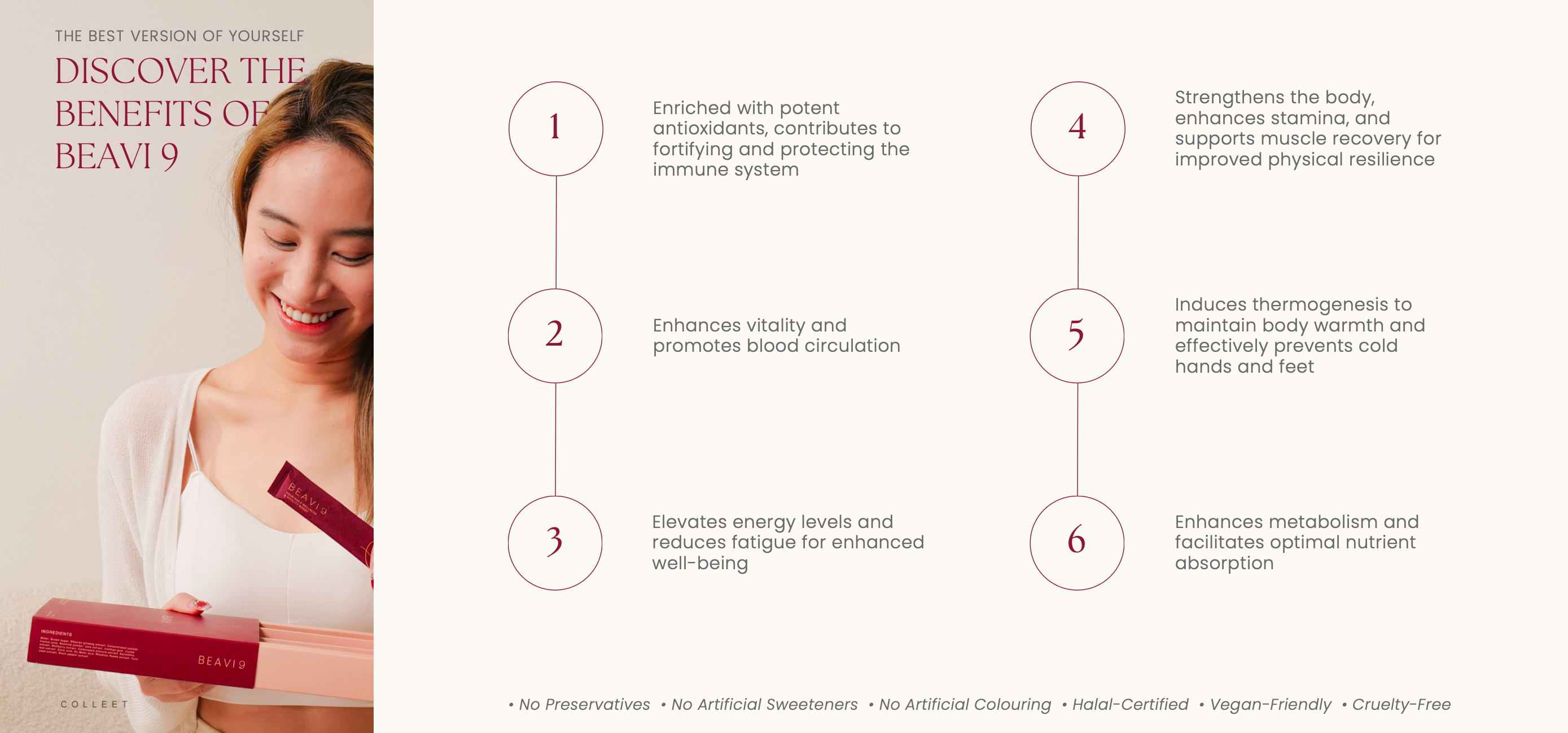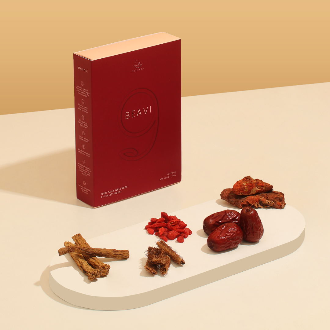 BEAVI 9, a refined blend of premium, handpicked natural herbs and ingredients sourced from Asia and Japan - is the perfect solution for those experiencing symptoms such as cold hands and feet, shortness of breath, fatigue, weak immunity, chronic coughs, constant back aches, and dull complexion due to low vitality.