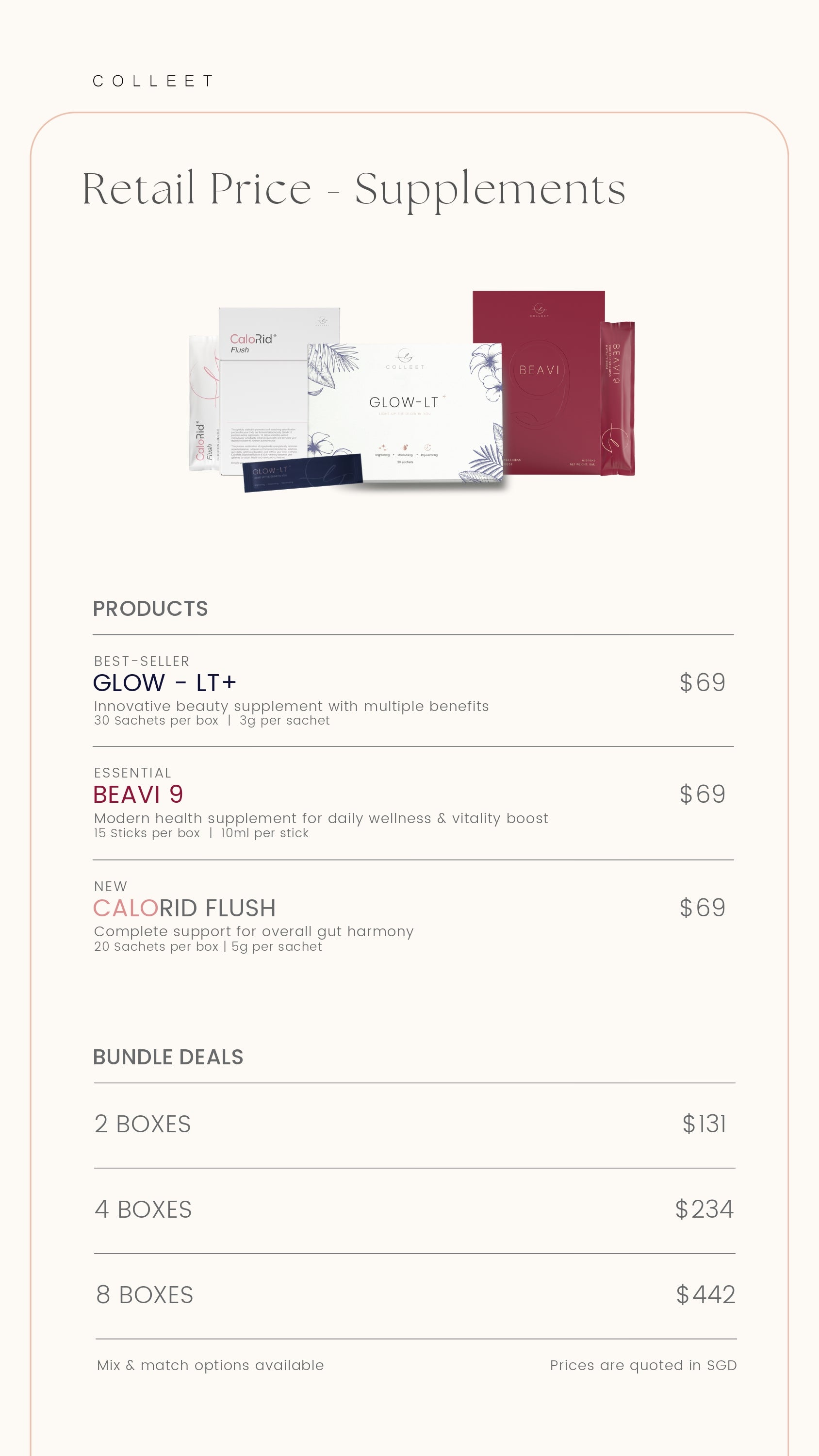 Repeat purchase of glow lt and beavi9, skin condition has improved so much and beavi9 gives me the extra energy everyday!